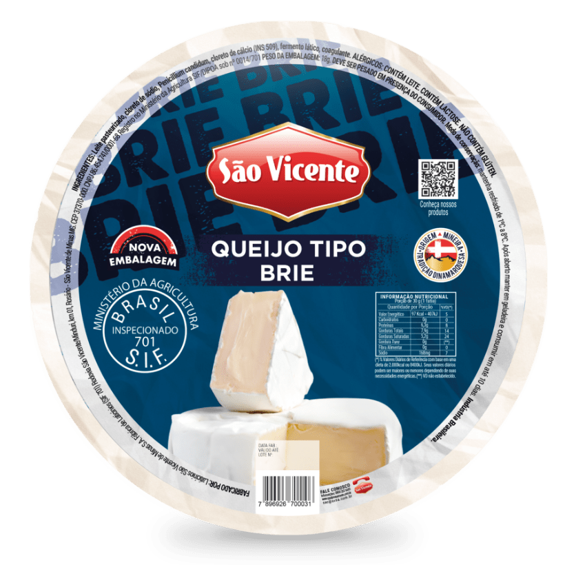 INGREDIENTES: Leite pasteurizado integral, cloreto de sódio, mofo Penicilium Candidum, cloreto de cálcio, fermento lático, coagulante. ALÉRGICOS: CONTÉM LEITE. NÃO CONTÉM GLÚTEN. CONTÉM LACTOSE.